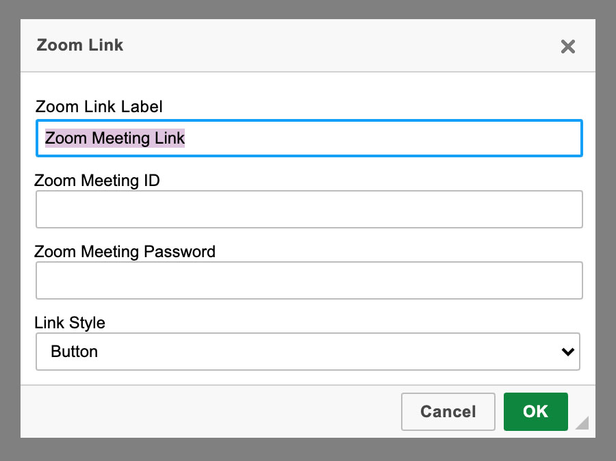 This new tool is available to add to any existing SoSimple CMS accounts. When the Zoom icon (pictured above) is clicked, a simple link integration window (pictured below) will appear. Simply copy and paste your meeting ID and meeting passwords into the corresponding boxes, then click OK.
