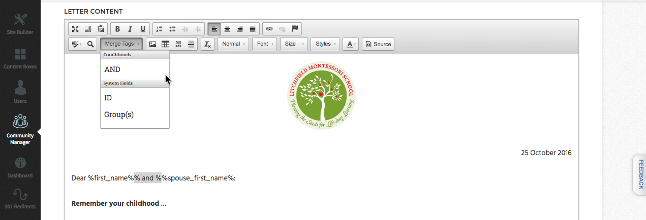 Recent updates to SoSimple CMS now allow users who have our Community Manager to insert conditional “AND” merge tags. This new feature comes in handy when sending out bulk communications (such as emails and letters) in addition to creating mailing labels.